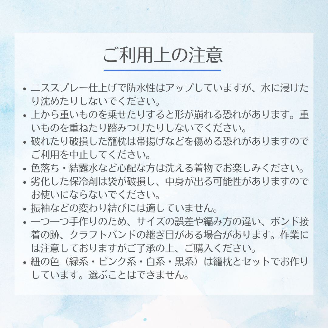 ・破れたり破損した籠枕は帯揚げなどを傷める恐れがありますのでご利用を中止してください。